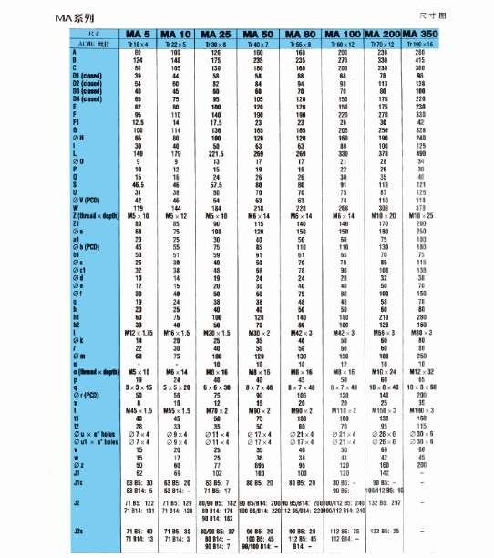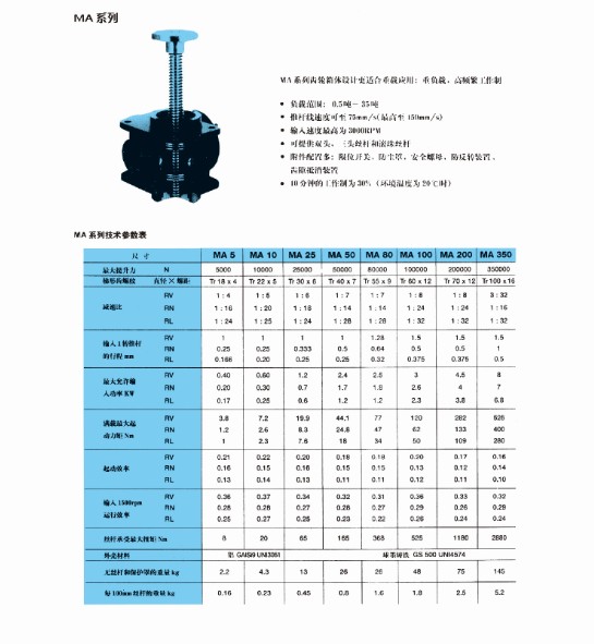 MA螺旋絲桿升降機(jī)設(shè)計(jì)更適合重載應(yīng)用,重負(fù)載,高頻繁工作制,負(fù)載范圍0.5噸~35噸,螺旋絲桿升降機(jī)升降速度可至75mm/s(最高至150mm /s),輸入速度最高為3000RPM,可提供雙頭,三頭絲杠和滾珠絲杠,10分鐘的工作制為30%(環(huán)境溫度為70℃)