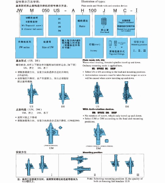 JWM絲桿升降機(jī)適用于低速低頻工況,廣泛應(yīng)用于機(jī)械、冶金、建筑、水利設(shè)備等行業(yè),具有起升、下降及借助輔件推進(jìn)、翻轉(zhuǎn)及各種高度位置調(diào)整等諸多功能。JWM蝸輪絲桿升降機(jī)是一種基礎(chǔ)起重部件,具有結(jié)構(gòu)緊湊、體積小、重量輕、動(dòng)力源廣泛、無(wú)噪音、安裝方便、使用靈活、功能多、配套形式多、可靠性高、使用壽命長(zhǎng)等許多優(yōu)點(diǎn)??梢詥闻_(tái)或組合使用,能按一定程序準(zhǔn)確地控制調(diào)整提升或推進(jìn)的高度,可以用電動(dòng)機(jī)或其它動(dòng)力直接帶動(dòng),也可以手動(dòng)。它有不同的結(jié)構(gòu)形式和裝配形式,且提升高度可按用戶(hù)的要求定制。